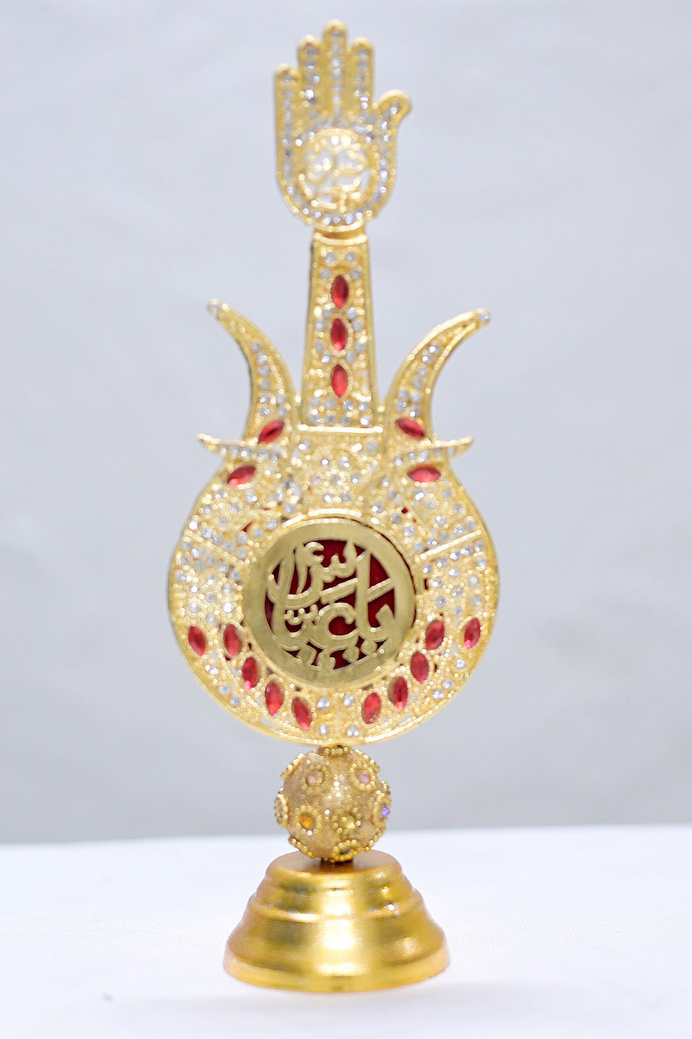Honor the legacy of the Panjetan Pak with this beautifully designed Alam Stand, featuring the sacred symbol of the Panja atop an intricate and radiant structure. Crafted with golden detailing, red gemstones, and sparkling crystals, this piece captures the spiritual essence of Islamic tradition. The round base ensures stability, while the central circular emblem is adorned with Arabic calligraphy reflecting devotion and reverence.
