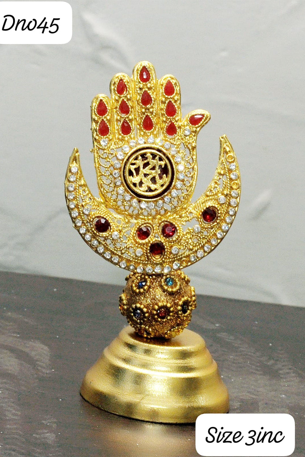 Celebrate the holy legacy of the Panjetan Pak with this beautifully designed Chand Panja Panjetan Set Stand. Crafted in a radiant golden finish, this elegant decorative piece features a symbolic Panja (hand) resting atop a crescent moon (Chand), both adorned with glittering red and white stones. At the heart of the Panja is an intricate calligraphic medallion representing the sacred names of the Panjetan (Prophet Muhammad ﷺ, Hazrat Ali A.S., Hazrat Fatima A.S., Imam Hasan A.S., and Imam Hussain A.S.).