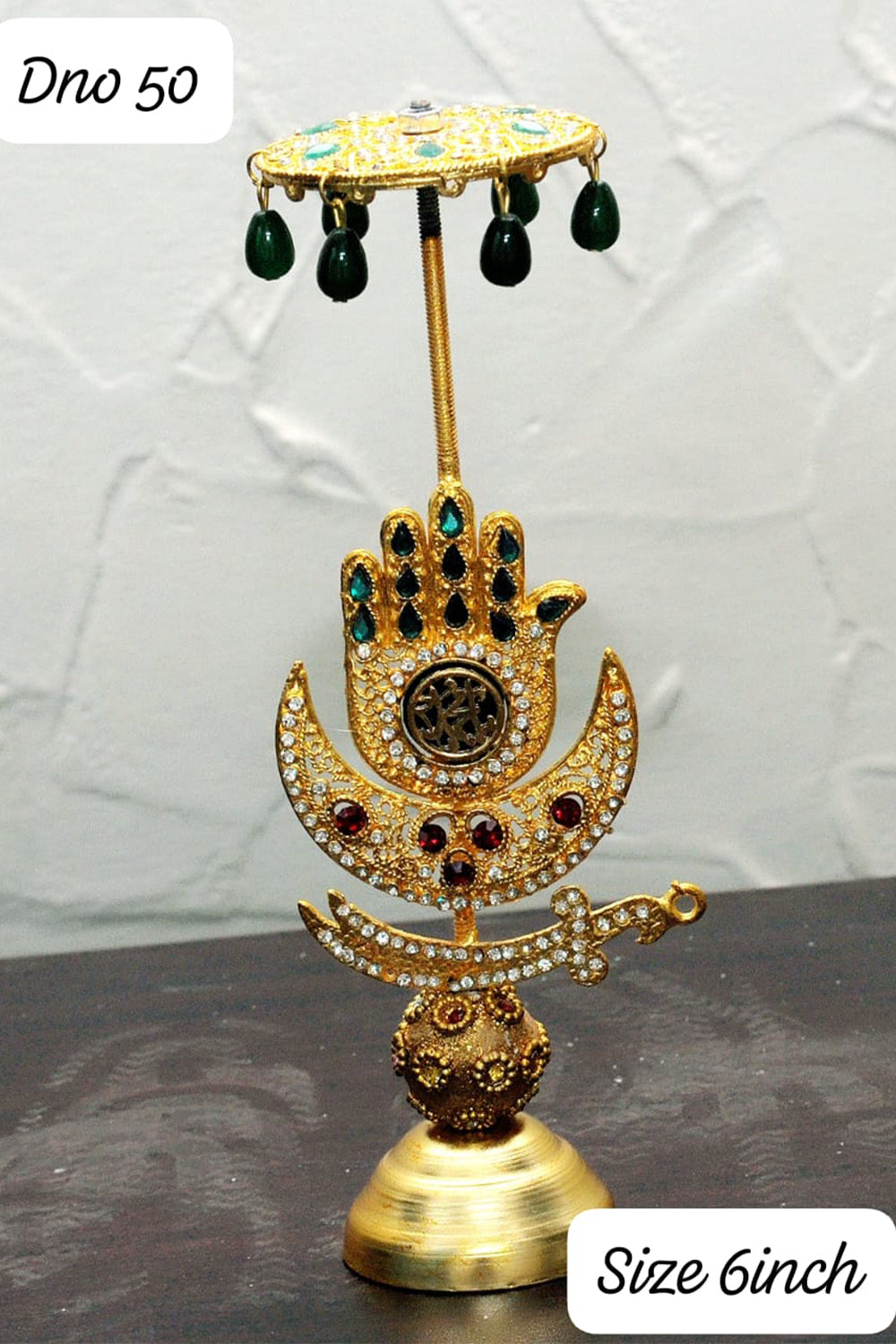 Celebrate your devotion to the Panjetan Pak with this stunning Chatri Panja Panjetan Pak Set — a 6-inch spiritual symbol crafted to reflect deep reverence and elegance. This ornate decorative piece features a beautifully embellished Panja (hand symbol) resting on a crescent moon and sword design, symbolizing strength, sacrifice, and spiritual purity.