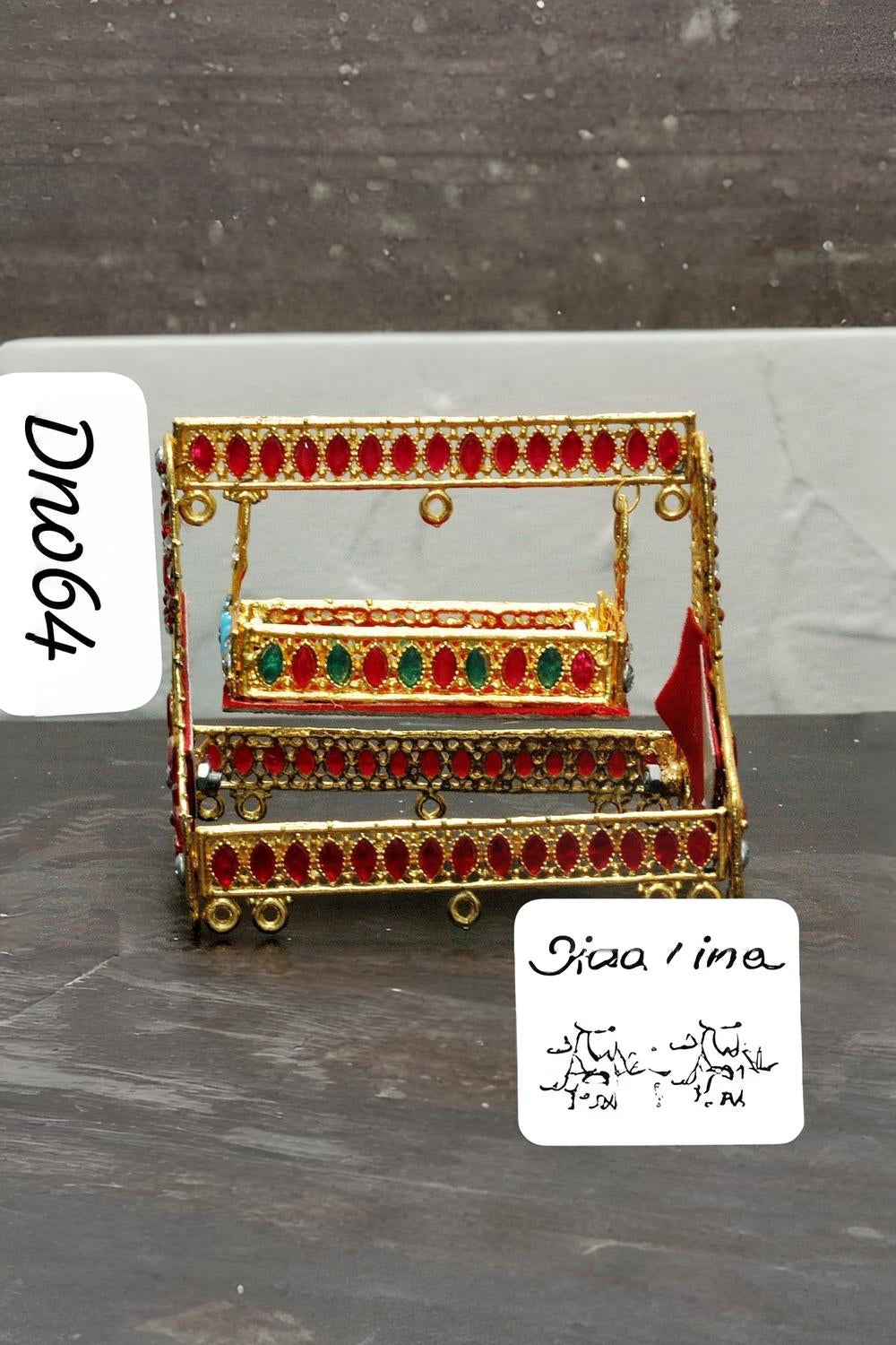 Delicately adorned with red and green crystal embellishments, the jhola (cradle) swings within an elegant golden frame. Its compact and ornamental design makes it a beautiful addition to your Muharram majlis, shrine décor, or a symbolic keepsake of devotion and remembrance.