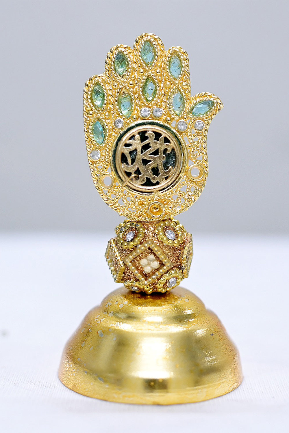 Intricately crafted with a gold-finish structure, this elegant piece features a beautifully detailed Panja (hand) adorned with shimmering green and white stones. At its center lies a gold calligraphic emblem, reverently inscribed to reflect spiritual grace and devotion.