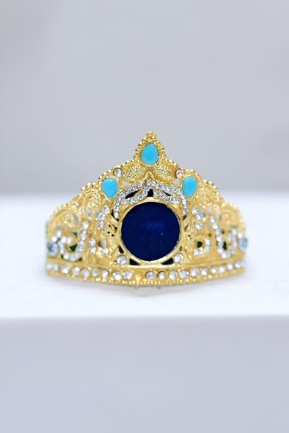 Royal crown shape with intricate gold-toned filigree craftsmanship.