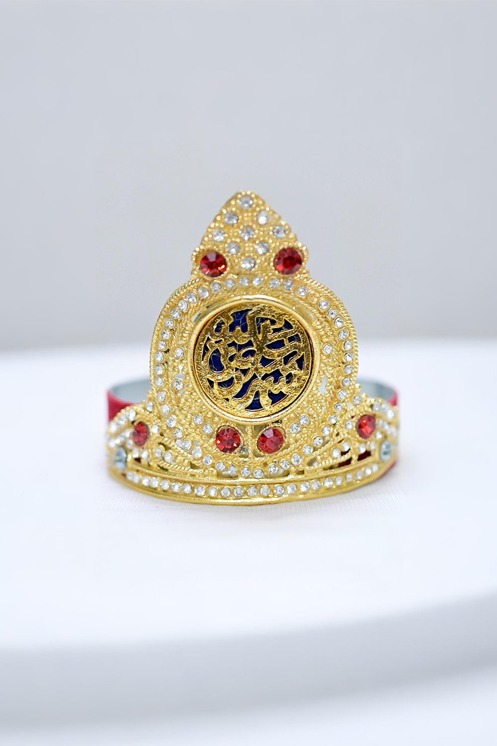 Honor the legacy of Shezadi Sakina (A.S) with this beautifully crafted Shezadi Sakina Taaj — a symbolic crown that reflects the grace, innocence, and strength of the beloved daughter of Imam Hussain (A.S). This exquisite piece features a stunning blend of gold-toned metalwork, encrusted with shimmering white stones and accented by vibrant red gems.